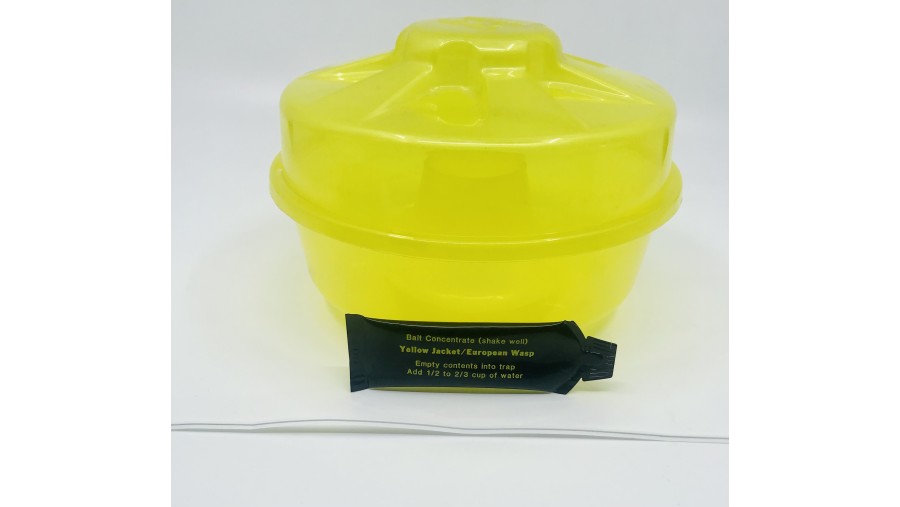 Σφηκοπαγίδα με σύρμα ώστε να κρεμιέται και δόλωμα που προσελκύει τις σφήκες ώστε να μπουν στο ειδικό δοχείο που δεν επιτρέπει την έξοδό τους.