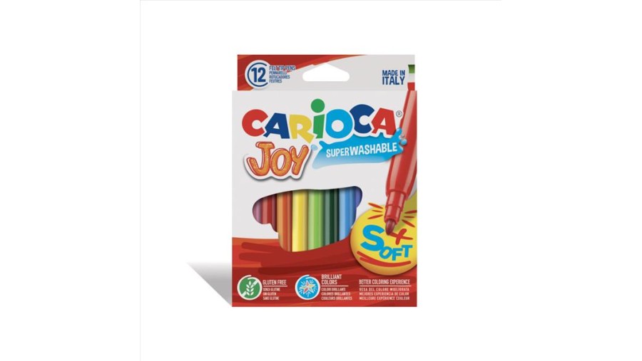 Δώδεκα πολύχρωμοι μαρκαδόροι Carioca με σούπερ πλενόμενο μελάνι, λεπτή και φραγμένη μύτη 2,8 mm και αεριζόμενο καπάκι.