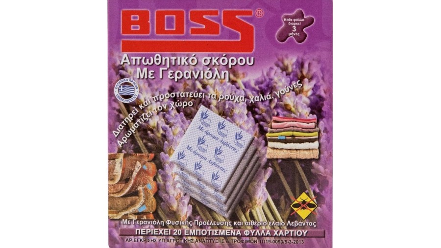 Βασικά χαρακτηριστικά: Προστασία από τον σκόρο,γ ια ρούχα, χαλιά, κουβέρτες κ.α. Με άρωμα λεβάντα. Με γερανιόλη φυσικής προέλευσης. Για ντουλάπες & συρτάρια.