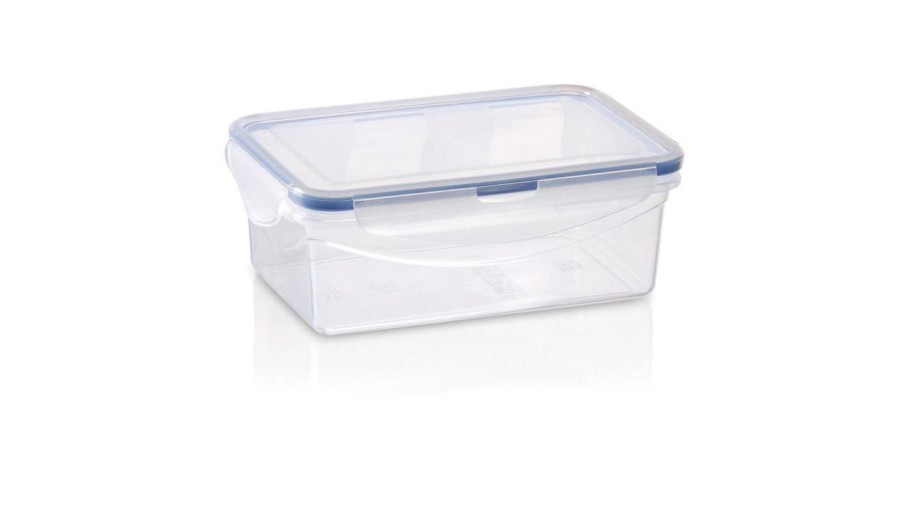Ορθογώνιο τάπερ με καπάκι ασφαλείας, κατασκευασμένο από πλαστικό υλικό που το κάνει ανθεκτικό και ελαφρύ.