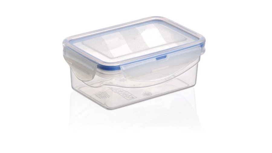 Ορθογώνιο τάπερ με καπάκι ασφαλείας, κατασκευασμένο από πλαστικό υλικό που το κάνει ανθεκτικό και ελαφρύ.