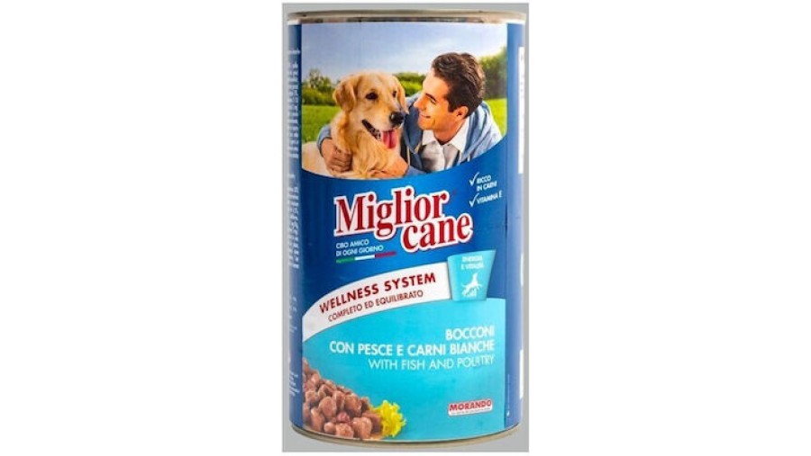 Υγρή τροφή MIGLIORCANE με γεύση ψάρι και λευκό κρέας, κατάλληλη για ενήλικους σκύλους οποιασδήποτε ράτσας και μεγέθους, συνιστάται για σκύλους με προβλήματα μάσησης.