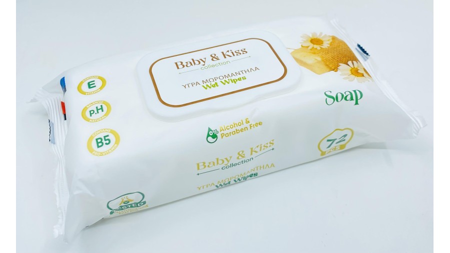 Ελεγμένα μωρομάντηλα Baby Kiss εμποτισμένα με ειδικό άρωμα, ιδανικό για εξάνθημα και σύγκαμα. Κατάλληλα για την ευαίσθητη επιδερμίδα του μωρού σας. Χωρίς αλκοόλ και paraben, με pH 5,5.